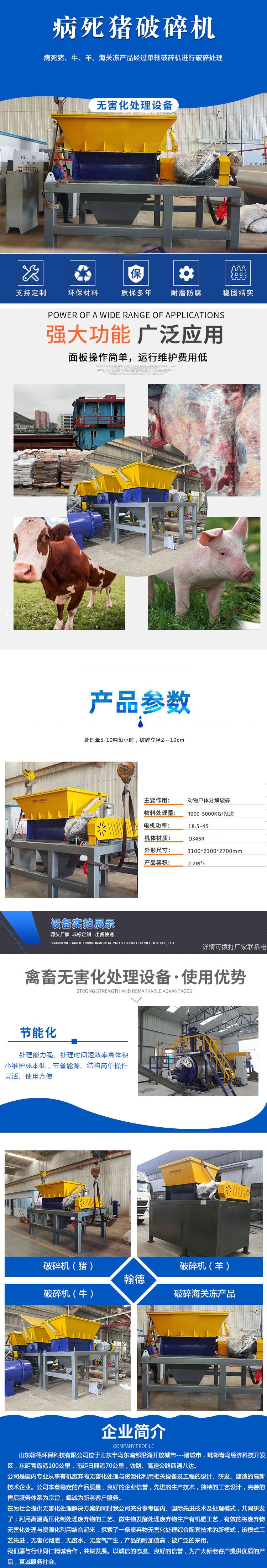 整头牛尸体破碎机 撕碎机 病死牛无害化处理设备是山东翰德制造生产的无害化处理前端设备,是将死牛等大型动物尸体破碎到40-50mm小块,通过螺旋输送机输送至化制烘干一体机进行灭菌烘干处理,大大加快了化制烘干的效率。该设备融合了众多破碎机的优点,并改善了设备在使用过程中所存在的弊端,且它的机型小巧,便于安装,能够适应各种复杂的工作环境,因此得到众多无害处理中心、屠宰场、养殖场、畜牧场、兽店、动物园、实验室等安全处理废弃物客户的一致欢迎。特点:独有的破碎方式,动刀、定刀持久耐用;针对于动物皮类较坚韧的物料,采用专用刀具,锋利耐磨;设计特有的装置,预防皮类缠绕刀片;大功率马达驱动,效率高,耗能低;可配套提升装置,直接自动进料,节省人工;可实现全程PLC控制,操作简便,维护费用低。